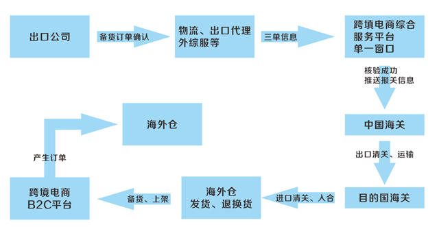 境内企业先将出口货物通过跨境物流运达海外仓,再通过跨境电商平台实现交易后从海外仓送达境外消费者。海外仓有自营型海外仓、第三方海外仓、亚马逊物流模式三种类型。
